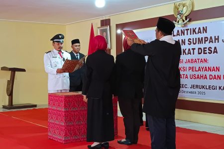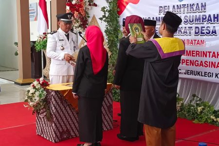 Jeruklegi Kulon, Kabupaten Cilacap, Selasa (06/01/2026) – Desa Jeruklegi Kulon Kecamatan Jeruklegi melaksanakan upacara pelantikan dan pengambilan sumpah jabatan bagi perangkat desa baru, sesuai dengan Persetujuan Pengangkatan Perangkat Desa Nomor 400.10.2/11492/26.