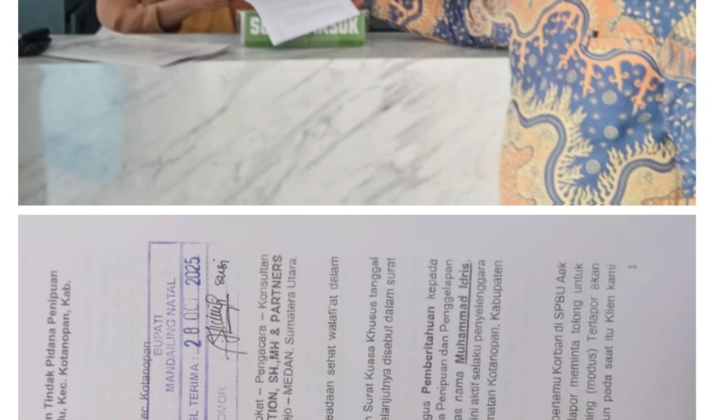 Panyabungan, 28 Oktober 2025 — Kasus dugaan tindak pidana penipuan dan penggelapan yang melibatkan oknum Kepala Desa Hutapungkut Julu, Kecamatan Kotanopan, Kabupaten Mandailing Natal, mencuat ke publik setelah dilaporkan secara resmi oleh Kantor Hukum Andi Candra Nasution, S.H., M.H. & Partners kepada Bupati Mandailing Natal dan Camat Kotanopan.