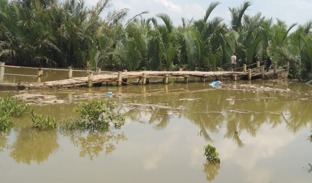 Jembatan yang dulunya kokoh dan dapat dilalui kendaraan roda dua, kini kondisinya miring dan bergelombang, serta hanya aman dilalui pejalan kaki.