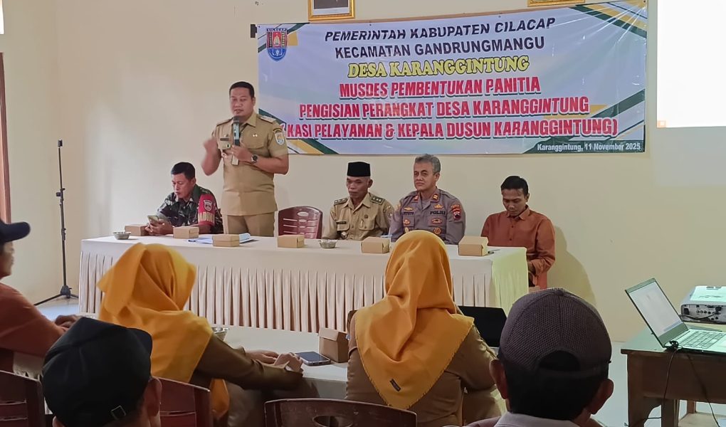 Karanggintung, Gandrungmangu – Pemerintah Desa Karanggintung, Kecamatan Gandrungmangu, Kabupaten Cilacap, menggelar Musyawarah Desa (Musdes) pada hari Selasa, 11 November 2025, bertempat di balai desa setempat. Agenda utama Musdes kali ini adalah pembentukan panitia pengisian perangkat desa, yang meliputi posisi Kasi Pelayanan dan Kepala Dusun Karanggintung.