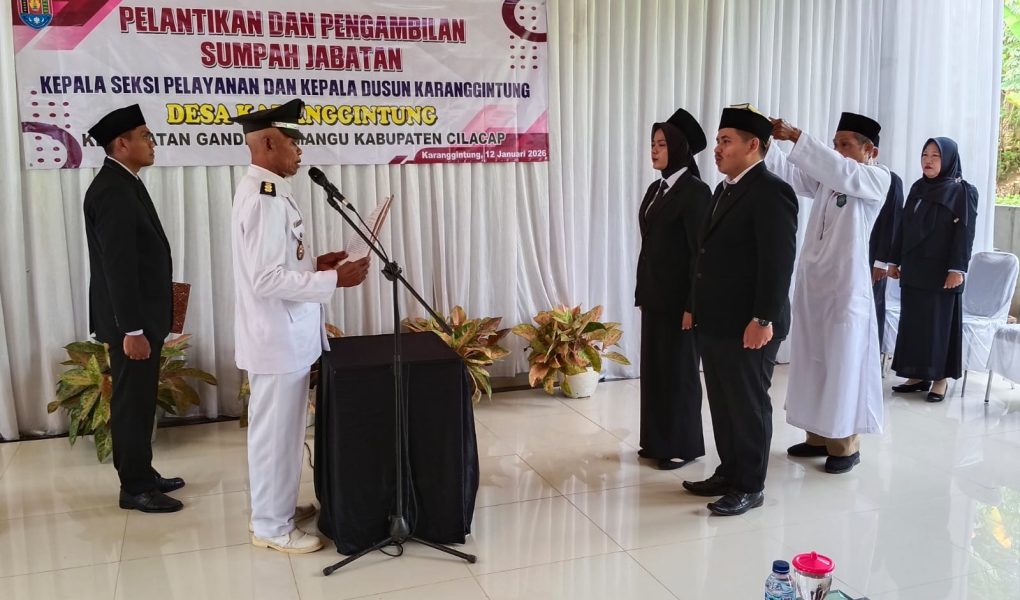 Pemerintah Desa Karanggintung melaksanakan acara pelantikan dan pengambilan sumpah jabatan Kepala Seksi Pelayanan serta Kepala Dusun Karanggintung, berdasarkan Keputusan Kepala Desa Karanggintung Nomor 400.10.2/01/Tahun 2026 dan Surat Bupati Nomor 400.10.2/96/26.