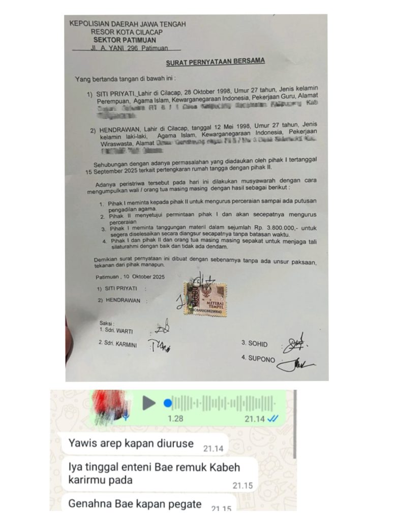 Menyikapi informasi tersebut, pada 7 Desember 2025 Wartawan mengkonfirmasi kepada SP terkait proses perceraian yang akan di urus oleh suaminya sesuai pernyataan yang tertuang pada surat pernyataan bersama yang ditetapkan di kantor polisi sektor patimuan ternyata hasilnya masih nihil dan belum di ceraikan.
