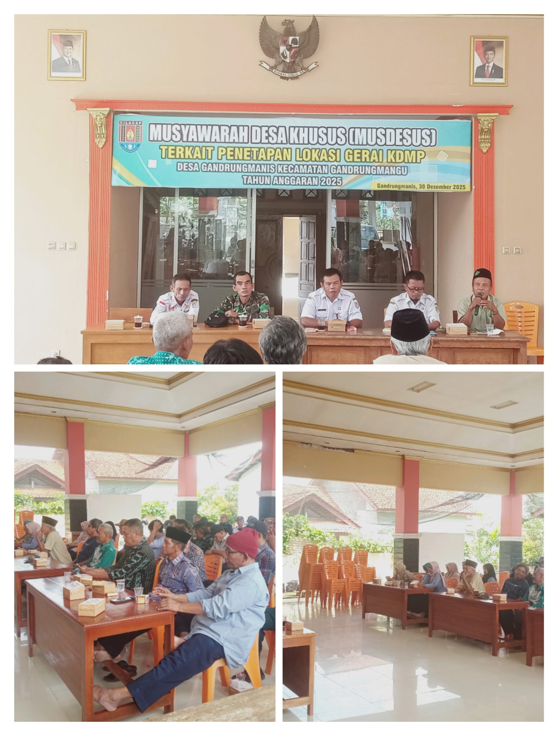 Gandrungmangu, 7 Januari 2026 – Pemerintah Desa Gandrungmanis, Kecamatan Gandrungmangu, menggelar Musyawarah Desa Khusus (MUSDESUS) untuk menetapkan lokasi Gerai Koperasi Desa Merah Putih (KDMP). Acara yang berlangsung di pendopo desa setempat ini dihadiri oleh berbagai elemen masyarakat dan pemerintah, menunjukkan komitmen bersama untuk meningkatkan perekonomian desa.