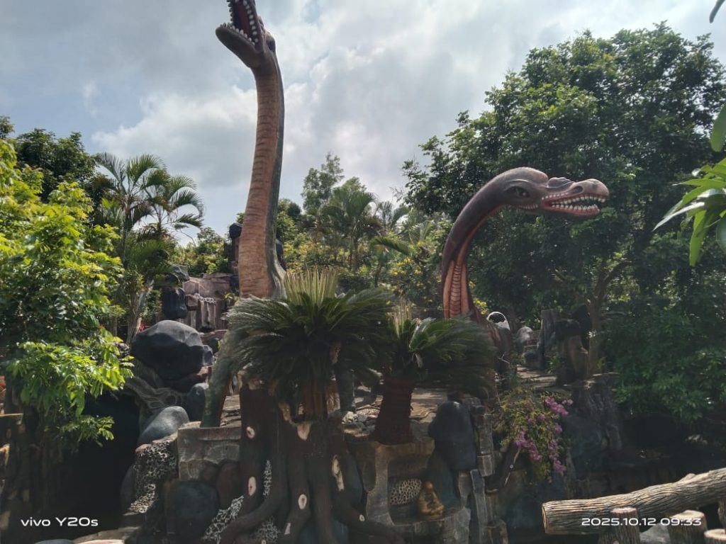 Berwisata foto dengan berbagai patung dinosaurus dan aneka satwa.